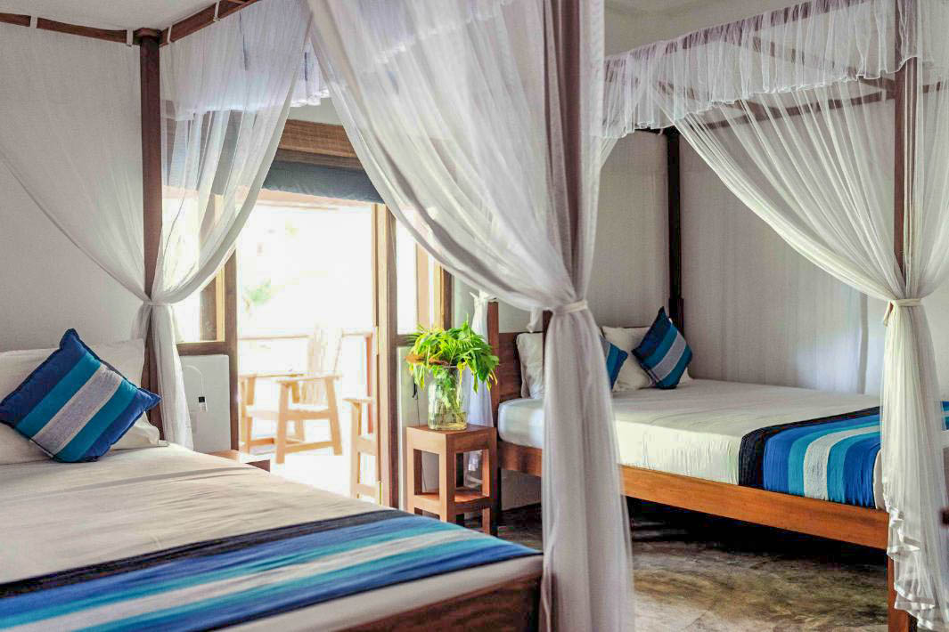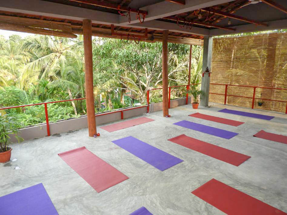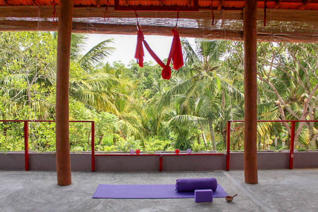 - Rooftop yoga shala with open jungle views