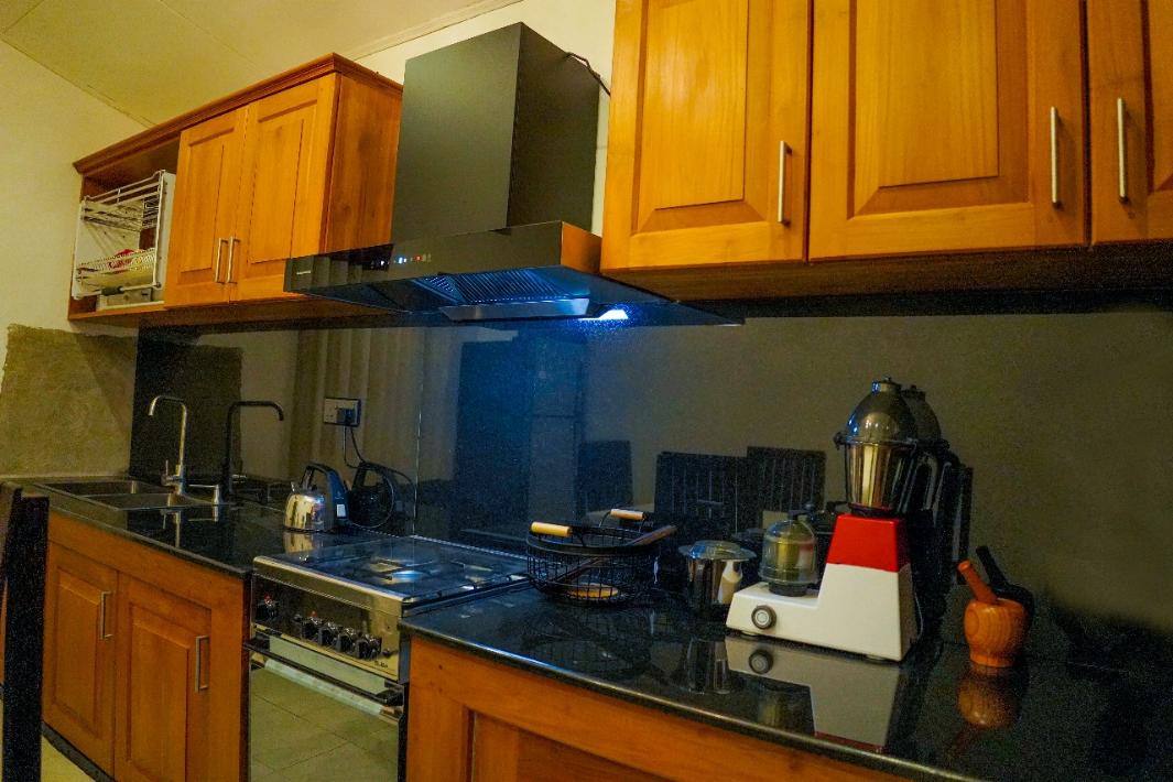 - Fully equipped Kitchen consisting of: Refrigerator, Cooker, and oven with electric and gas Electric Kettle, Microwave Oven, Bread Toaster, Fruit Juicer, Kitchen utensils, Plates, Half plates, Glasses, Cutlery all sufficient for 12 persons.